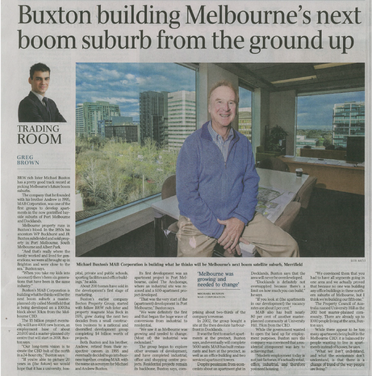 On Thursday 10 July 2014 The Australian ran a story about Executive Director, Michael Buxton. “BRW rich lister Michael Buxton has a pretty good track record at picking Melbourne’s future boom suburbs.”